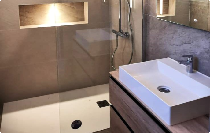 Nos équipes assurent la rénovation complète ou la création de votre salle de bains : plomberie, carrelage, électricité, pose des meubles et finitions.